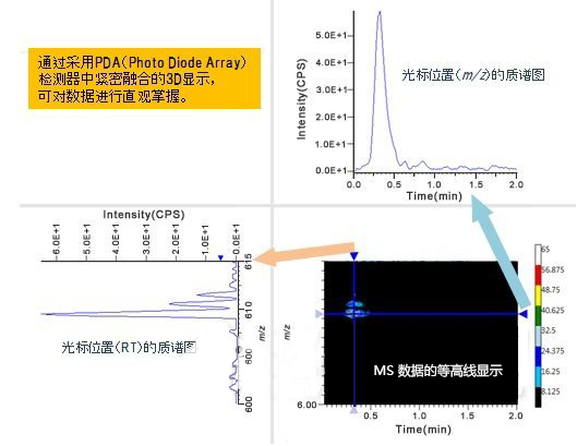 通過等高線顯示等可對整體的色譜洗脫模式進行確認。與HPLC的DAD(二極管陣列)檢測器的解析畫面非常相似且簡單易懂的操作畫面,實現了與一般HPLC檢測器相同的操作性。