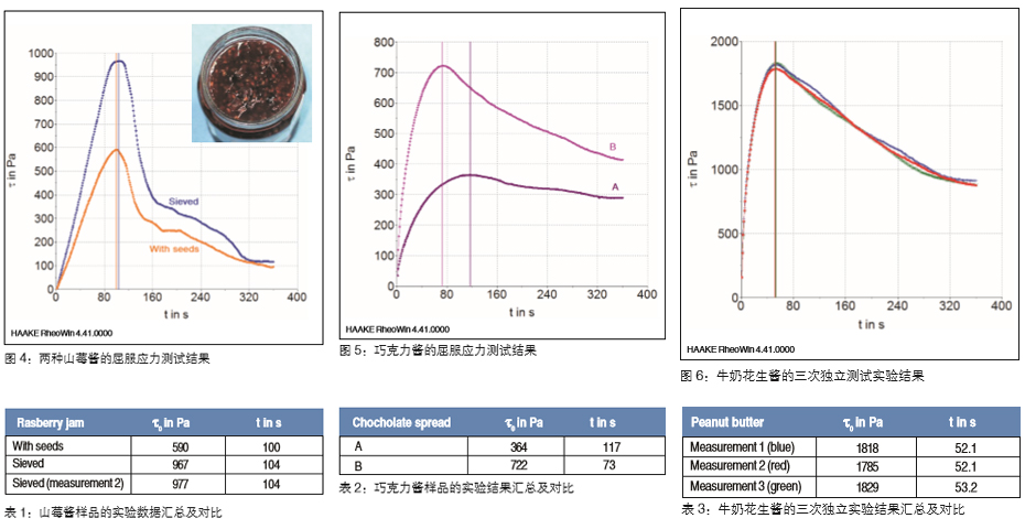 圖 5 和表 2 的數據是兩種巧克力醬產品 A 和 B 的實驗結 果。其中 A 樣品中含有更多的可可、蛋白質和糖分,但是其脂肪含量要小于B樣品。另外,兩種產品所使用的乳化劑也不一樣,A用的是大豆提取物,而B則是提取自向日葵。結果表面B樣品的屈服應力幾乎超過A的兩倍以上。槳葉轉子重復性實驗使用的是FL16型號轉子,樣品是牛奶花生醬。圖6和表3的結果表明,在三次獨立的實驗結果中,數據重復性非常好,并且屈服應力數據與平均值之間的誤差只有1.5%,其發生屈服的時間也基本一致。