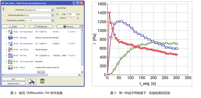 本文使用賽默飛 哈克Viscotester iQ智能流變儀配合 兩種4 葉片的槳葉式轉子(FL16 和 FL22)在通用夾持 器上通過控制速率模式進行實驗,轉子葉片直徑分別為 16 和 22 毫米,高度分別為8.8 和 16 毫米(圖1),儀 器轉速設置為0.05rpm。5 中市售醬類產品分別使用不 同的轉子,采用相同的實驗參數進行測試。將產品容器 蓋子打開,直接放置在通用夾持器上面。利用手動控制 升降功能和哈克 TMRheoWinTM 軟件設置(圖 2)以保證 轉子保持靜止,然后垂直的將轉子插入到具有高度重復 性的測量位置。實際經驗表明,較硬的產品在生產線上 以較高的速度罐裝時,產品在容器內的不同區域可能表 現出不一樣的性質。因此每次實驗都必須保證槳葉轉子 在產品容器中的位置是相同的,以確保測試結果的重復 性和可靠性。當樣品經過短暫的平衡和恢復后,測試時 間被重置為 0。然后設置一個非常低轉速(0.05rpm), 旋轉的時間以及在此時間段內所需要的數據點的數量。 最后可以加入數據自動評估的設置以及生成實驗報告。 實驗報告可以保存為多種格式(比如 pdf,jpeg,tiff 等) 或者直接由打印機輸出。對于每一類樣品,都需要進行 簡單的預實驗來確定最合適的轉子型號。比如較小尺寸 的轉子適合測試具備較高屈服應力的樣品,比如花生醬; 而尺寸大的轉子則適用于測試低粘度、低屈服應力的樣 品,例如巧克力醬,果醬或者蛋黃醬 [7]。為了確定合適 的轉速,則需要進行多種轉速的實驗。轉速太高則會在 曲線上形成一個難以計算的尖峰(圖3中紅色三角形),轉速太低則會產生漸進型的曲線(圖3 綠色圓圈)。而 我們的目的是選擇一個合適的轉速,使得實驗曲線具有 一個可以評估的最大值(圖3 藍色長方形)。前期實驗 證明,0.05rpm 的轉速是最適合這些樣品的。
