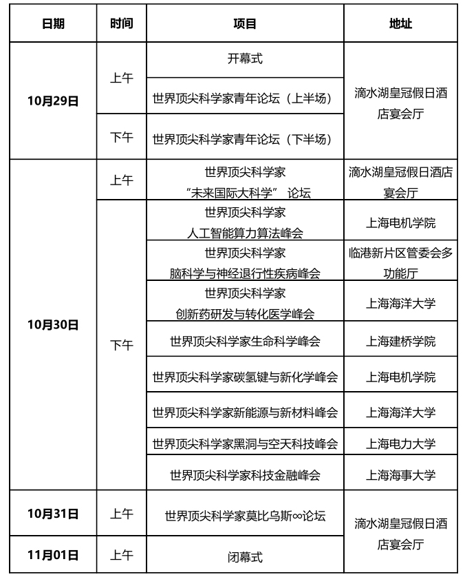主要內容:領導致辭、科學家致辭、主旨演講參會對象:上海市領導、世界頂尖科學家、中國兩院院士、世界頂尖青年科學家、政府部門、科研院所、高校、醫院、企業及媒體等約 500 人。